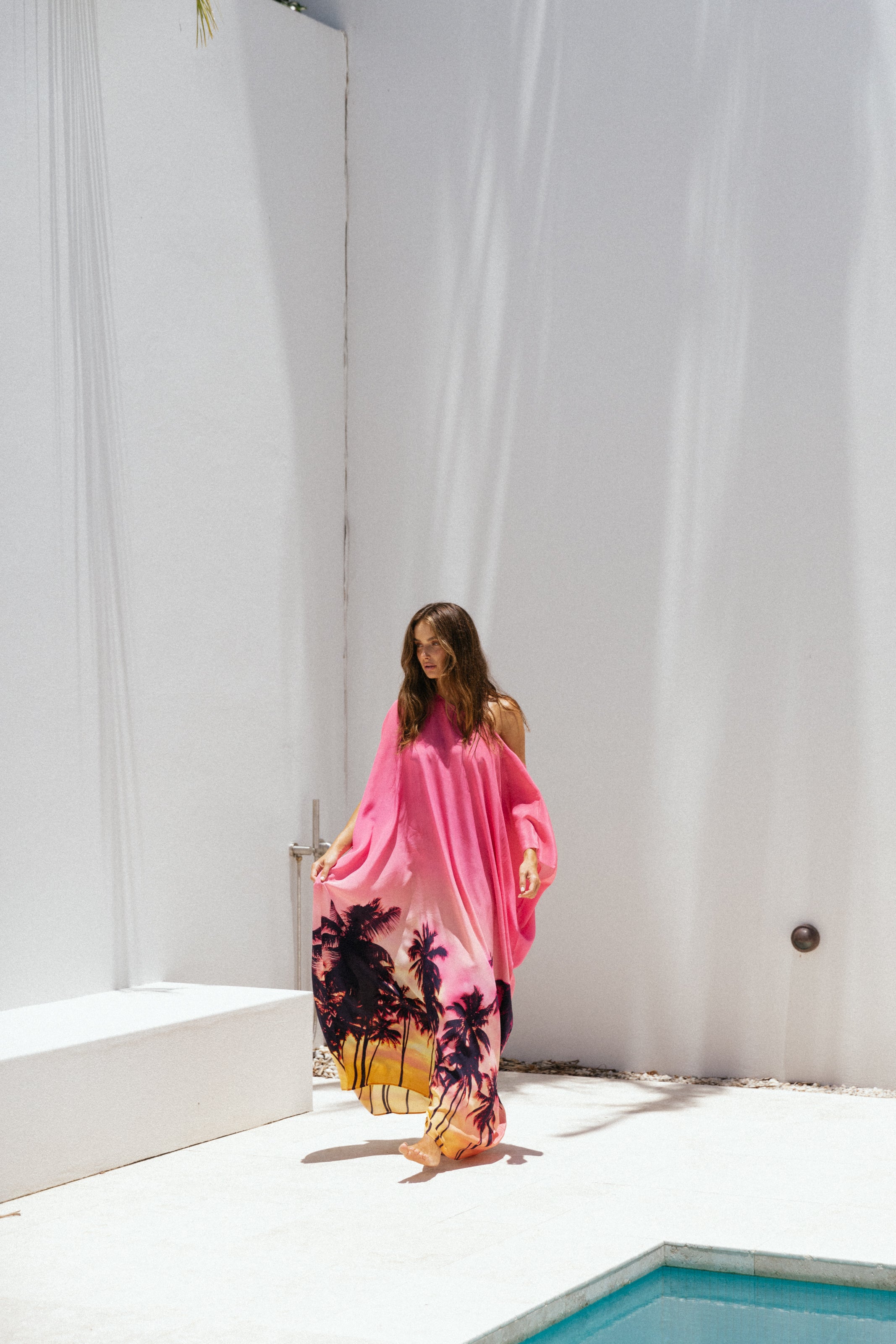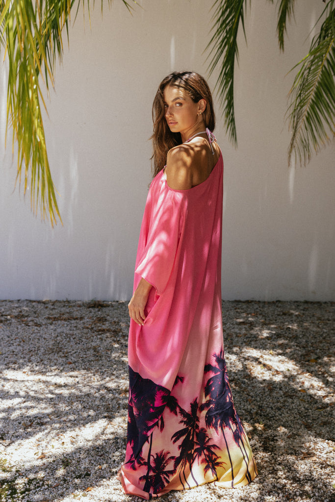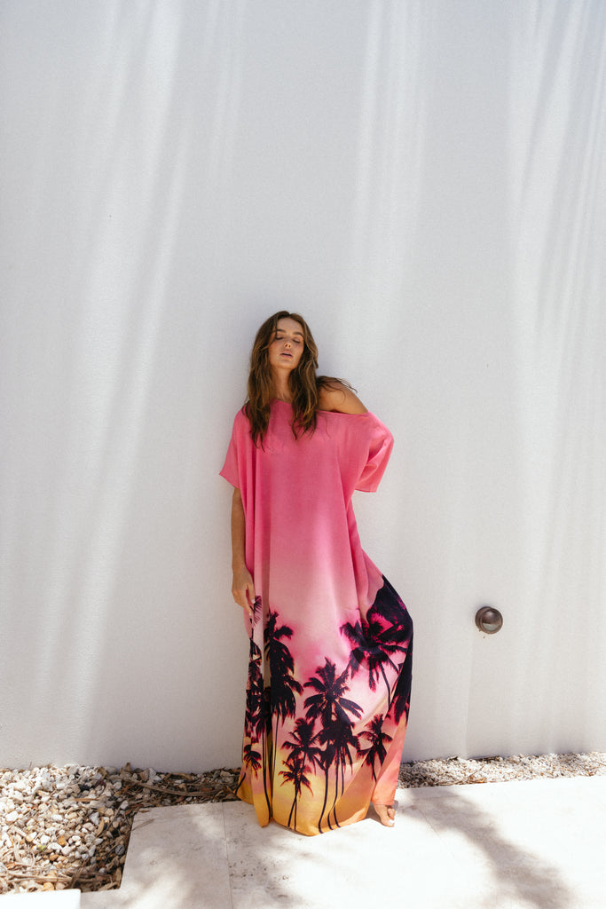 Crafted from 100% silk, the Classic Kaftan Flamingo Palms features a fluid slip-on silhouette with a softly rounded neckline and off-shoulder cut. The semi-sheer, breathable silk drapes effortlessly over the body, finished with refined detailing for a polished touch. Its one-size design ensures a flattering fit across a variety of body types, making it an elegant choice for layering or wearing alone as a luxurious statement piece. The vibrant Flamingo Palms print brings a touch of tropical sophistication, blending everyday comfort with timeless style.