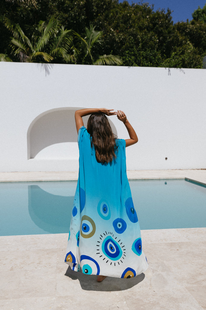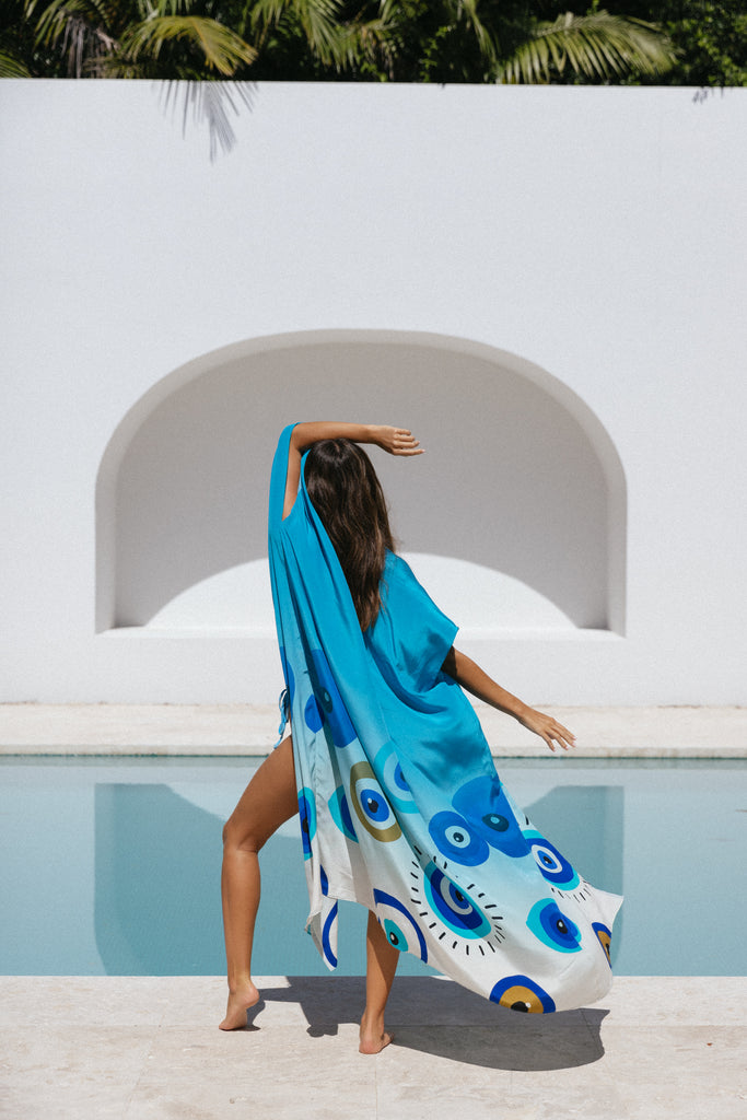 Crafted from 100% silk, the Button Front Kaftan Evil Eye offers a relaxed, easy fit that drapes gracefully over the body. Featuring an open front with button closure, it balances stylish ease with practical versatility. The one-size design ensures a comfortable, flattering silhouette across different body types. With its striking evil eye motif, this kaftan makes a bold, luxurious statement while remaining perfect for layering or standalone wear.